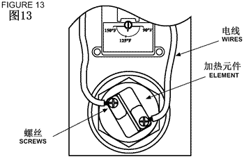 斷開加熱元件上的電線(如圖13)。使用1.5英寸的套筒扳手按反時針方向旋轉拆卸加熱元件上的螺絲。拆卸原有的墊圈。