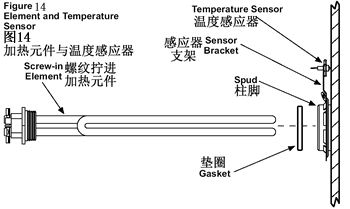 確保所要替換的新加熱元件具有正確的額定電壓和功率。在新的加熱元件上套上新的墊圈,插入熱水器內膽(如圖14)。按順時針方向旋轉緊固加熱元件,直至安全牢靠為止。