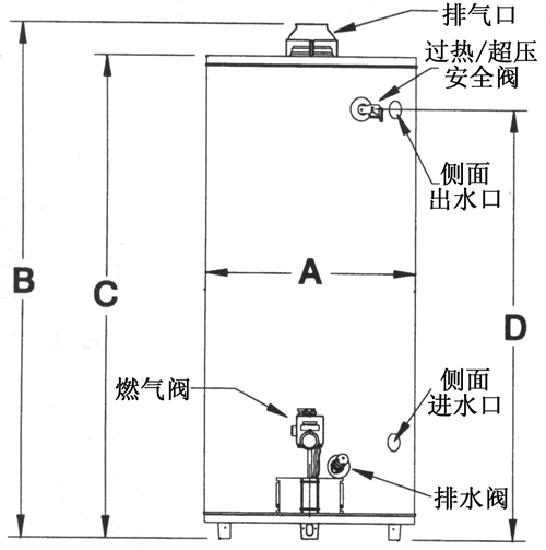 在本款40加侖和50加侖型號的熱水器上,進水口和出水口在熱水器頂部,適用于室內熱水供應。側面進水口和出水口熱水器適用于建筑物供熱或環流供熱系統,其中:75加侖型號熱水器有兩種類型:直徑為1英寸的頂部進水口和出水口類型,以及直徑為3/4英寸的側面進水口和出水口類型。100加侖型號熱水器只有直徑1.25英寸頂部進水口和出水口一種類型。