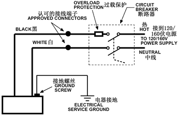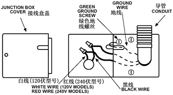 火災危險 要采用適當尺寸的實心銅線。 要采用通過美國UL認證的應變消除裝置。 將地線連接到綠色的底線螺絲上。 否則可能導致傷亡、火災或觸電。 Fire Hazard Use proper size solid copper wire. Use a UL approved strain relief. Connect ground wire to green ground screw. Failure to do so can result in death, fire, or electrical shock. |